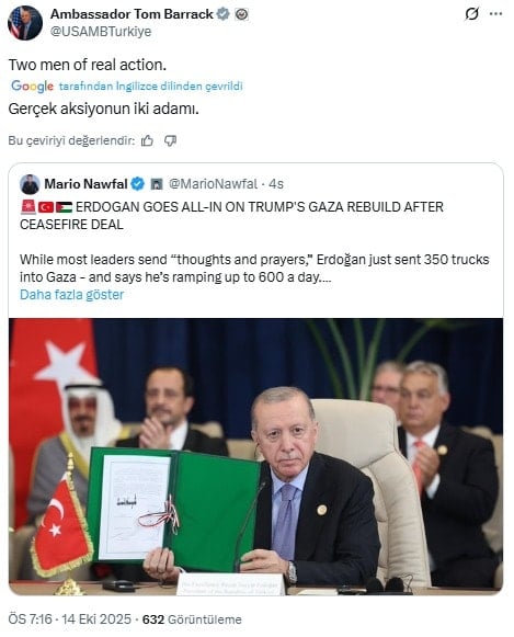 Barrack’ın alıntıladığı gönderide Erdoğan ve Trump’ın Gazze’deki krizin çözümü için sarfettiği çaba Anadolu Ajansı kaynak verilerek anlatıldı.