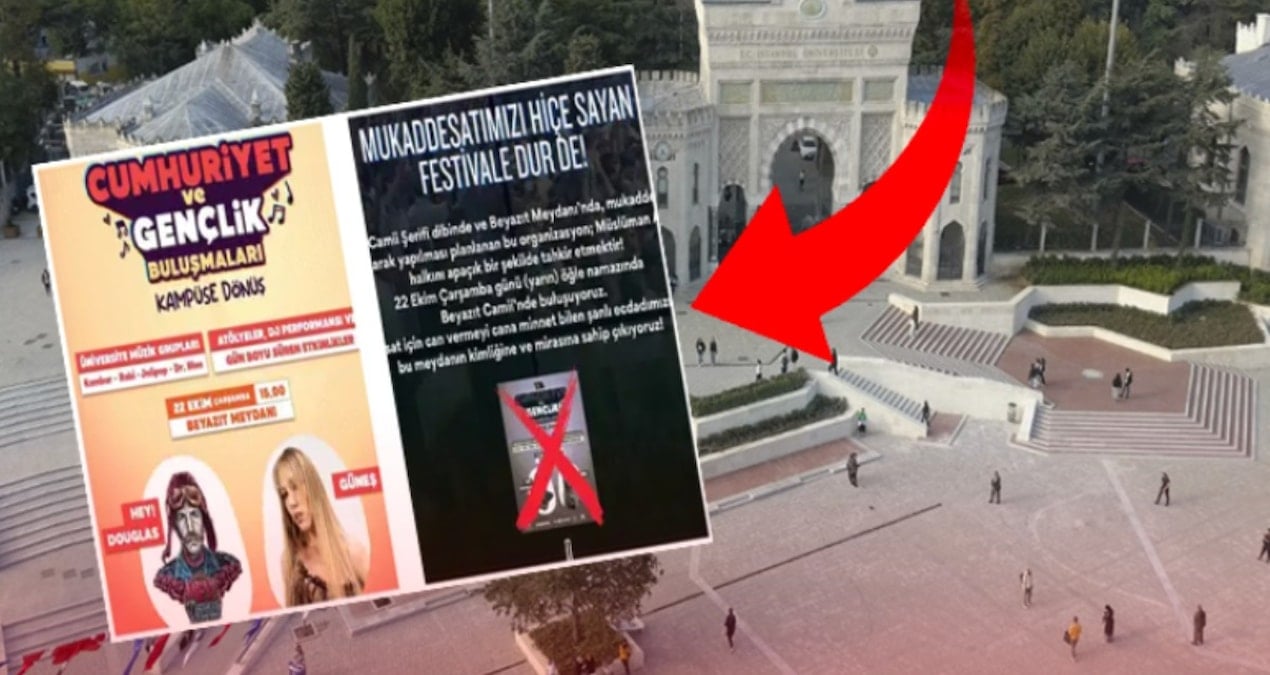 Sosyal medyadan bildiri yayımlayan gericiler, meydandaki camiye olan hassasiyetlerini gerekçe göstererek Beyazıt Meydanı’nda konser saatinde toplanma çağrısı yaptı.